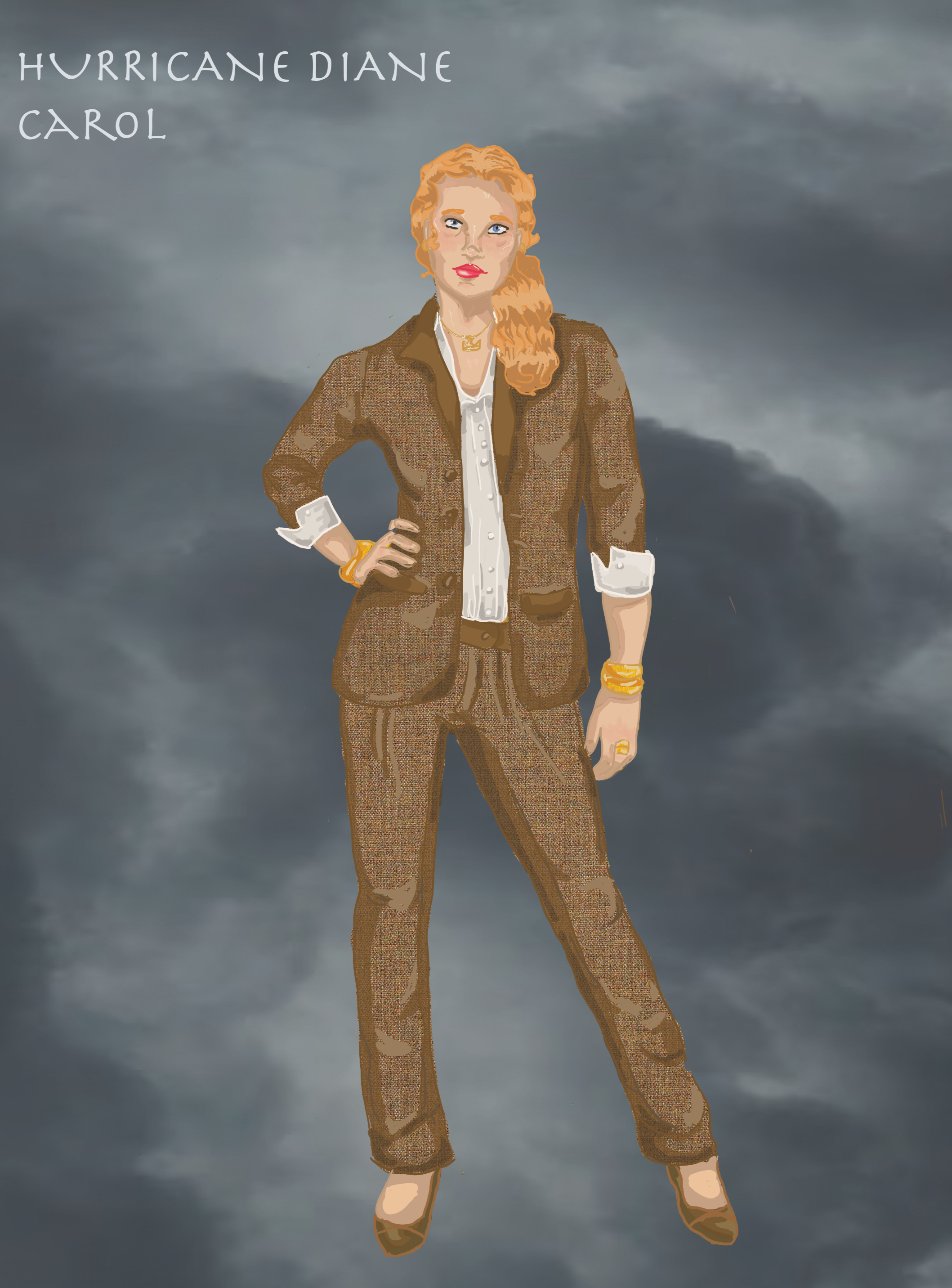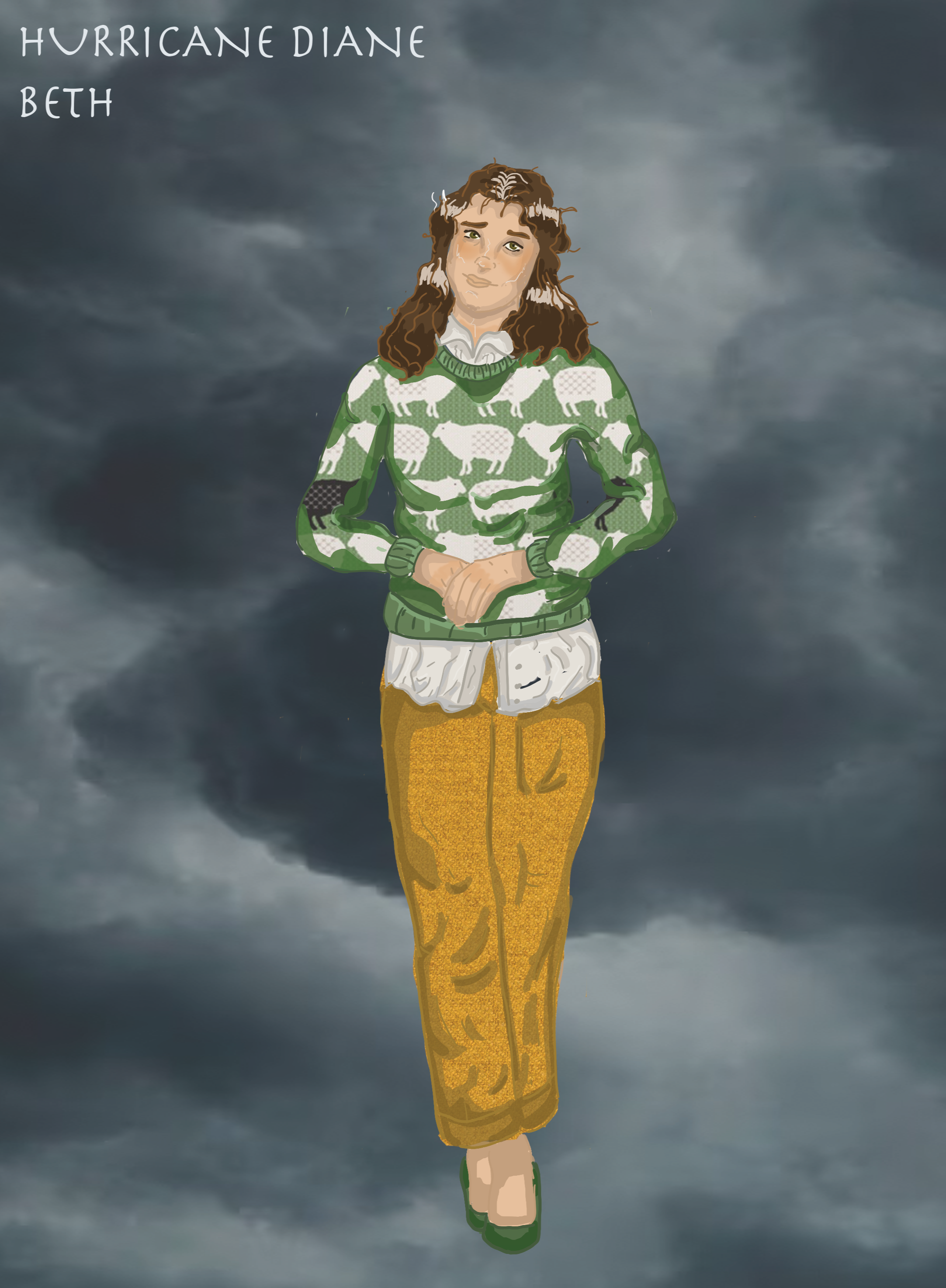 My Design process for Hurricane Diane was heavily based on research of Grecian Myth and symbols with our team successfully integrating not only the well known and more subtle motifs , but emblematic colors and even the shape of the clothes themselves into the language of our show.